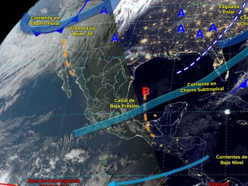 El frente frío número 20 se extenderá sobre el noroeste de la República Mexicana, asociado con una vaguada polar, ocasionará chubascos y lluvias puntuales fuertes, además de rachas fuertes de viento y tolvaneras en el noroeste y norte del territorio nacional. Asimismo, se presentarán condiciones para la caída de aguanieve o nieve en las sierras de Sonora y Chihuahua a partir de la noche.