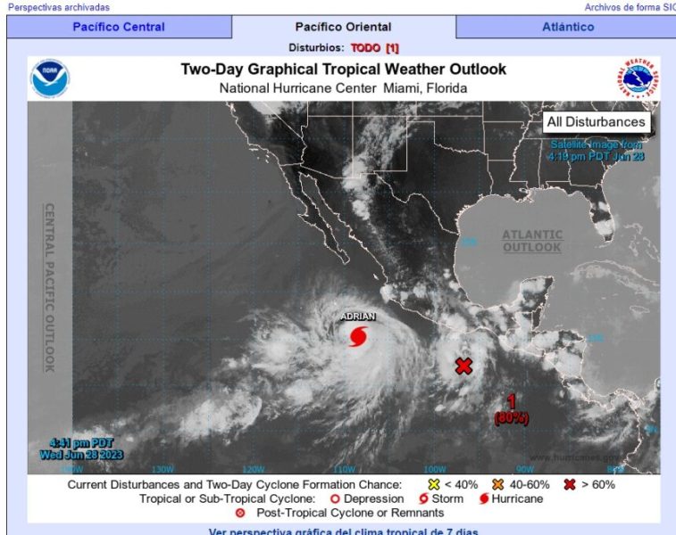 Por otro lado, en el mismo Océano Pacífico se localiza el Huracán Adrián a 550 kilómetros al suroeste de las costas de Jalisco. Este sistema no representa peligro para el estado por su lejanía.