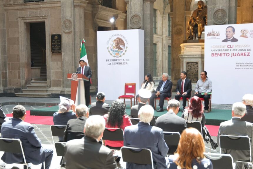 “Juárez es un sinónimo de identidad mexicana, de raíz profunda, de sabia humildad y de unidad ante cualquier desafío”, expresó durante este acto que contó con la presencia de la secretaria de Gobernación, Luisa María Alcalde Luján; el jefe de Gobierno de la Ciudad de México, Martí Batres Guadarrama; y el presidente municipal de Guelatao de Juárez, Aldo González Rojas, quienes también rindieron homenaje al más universal de los mexicanos.