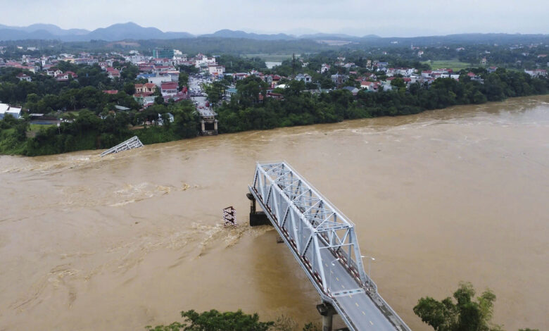 En la provincia de Phu Tho continuaban las labores de rescate luego que un puente de acero sobre el crecido río Rojo se derrumbara el lunes por la mañana. Diez autos y camionetas, así como dos motocicletas, cayeron al río, de acuerdo con los reportes. Algunas personas fueron sacadas del agua y trasladadas a un hospital, pero había al menos otras 10 desaparecidas.